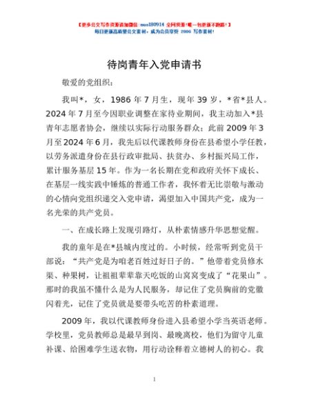 / 待岗青年入党申请书