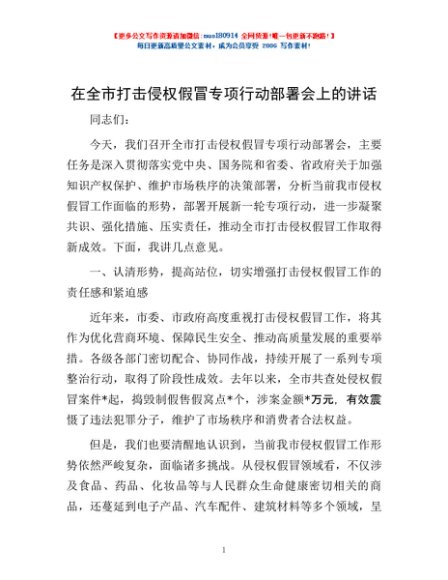 / 在全市打击侵权假冒专项行动部署会上的讲话