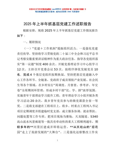 / 2025年上半年抓基层党建工作述职报告