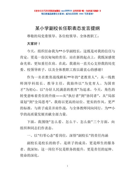 / 某小学副校长任职表态发言提纲