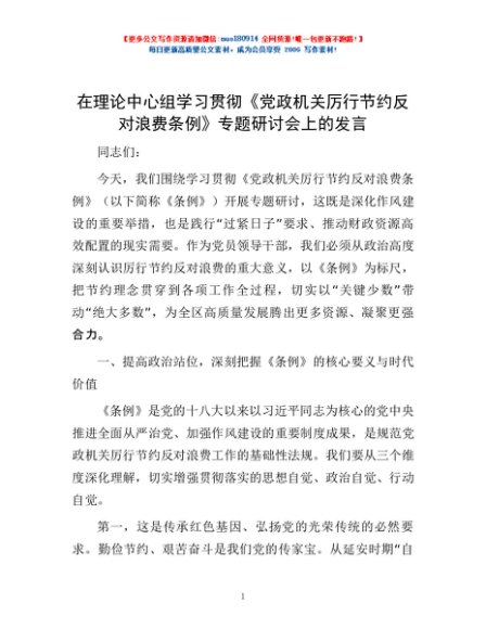 / 在理论中心组学习贯彻《党政机关厉行节约反对浪费条例》专题研讨会上的发言