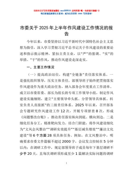 / 市委关于2025年上半年作风建设工作情况的报告