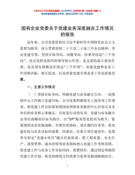 / 国有企业党委关于党建业务深度融合工作情况的报告