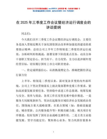 / 在2025年三季度工作会议暨经济运行调度会的讲话提纲