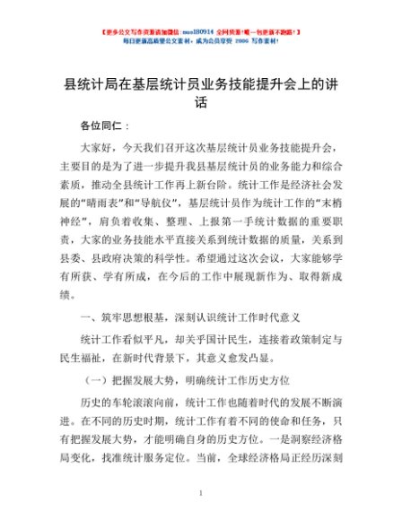 / 县统计局在基层统计员业务技能提升会上的讲话