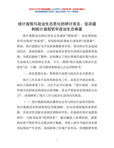 / 统计造假与政治生态恶化的研讨发言:坚决遏制统计造假筑牢政治生态根基