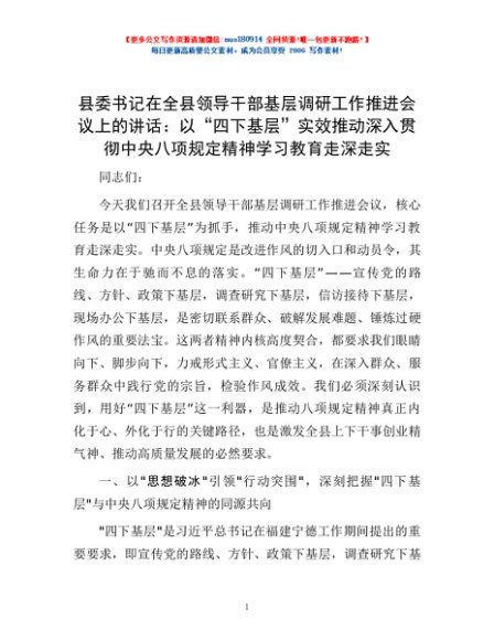 / 县委书记在全县领导干部基层调研工作推进会议上的讲话:以“四下基层”实效推动深入贯彻中央八项规定精神学习教育走深走实