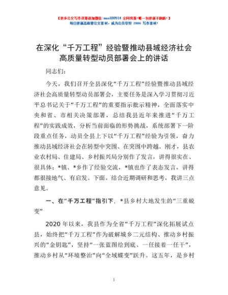 / 在深化“千万工程”经验暨推动县域经济社会高质量转型动员部署会上的讲话