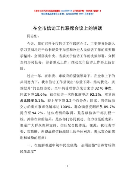 / 在全市信访工作联席会议上的讲话