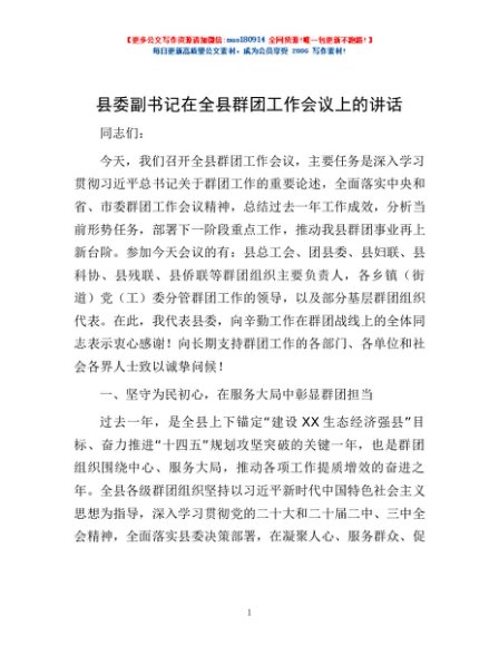 / 县委副书记在全县群团工作会议上的讲话