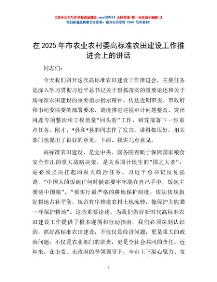 / 在2025年市农业农村委高标准农田建设工作推进会上的讲话
