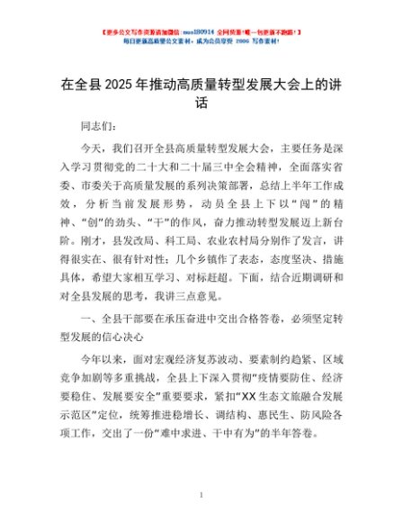 / 在全县2025年推动高质量转型发展大会上的讲话