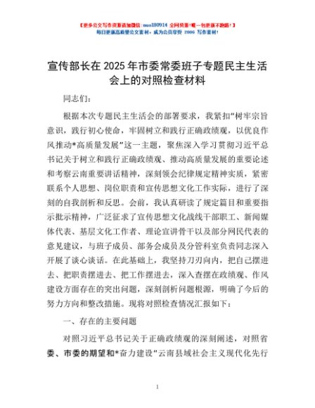 / 宣传部长在2025年市委常委班子专题民主生活会上的对照检查材料