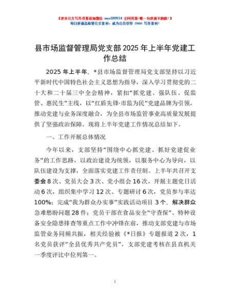 / 县市场监督管理局党支部2025年上半年党建工作总结