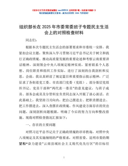 / 组织部长在2025年市委常委班子专题民主生活会上的对照检查材料