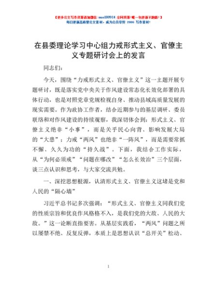 / 在县委理论学习中心组力戒形式主义、官僚主义专题研讨会上的发言