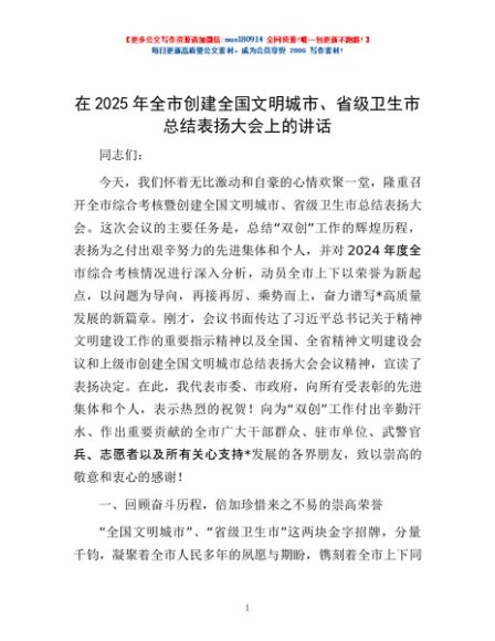/ 在2025年全市创建全国文明城市、省级卫生市总结表扬大会上的讲话