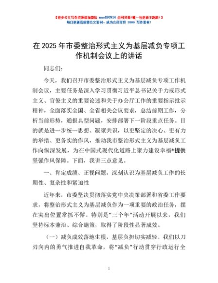 / 在2025年市委整治形式主义为基层减负专项工作机制会议上的讲话