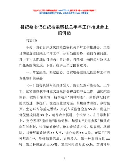 / 县纪委书记在纪检监察机关半年工作推进会上的讲话