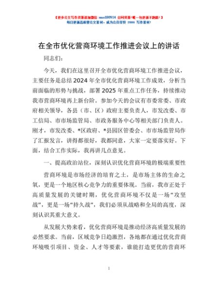 / 在全市优化营商环境工作推进会议上的讲话