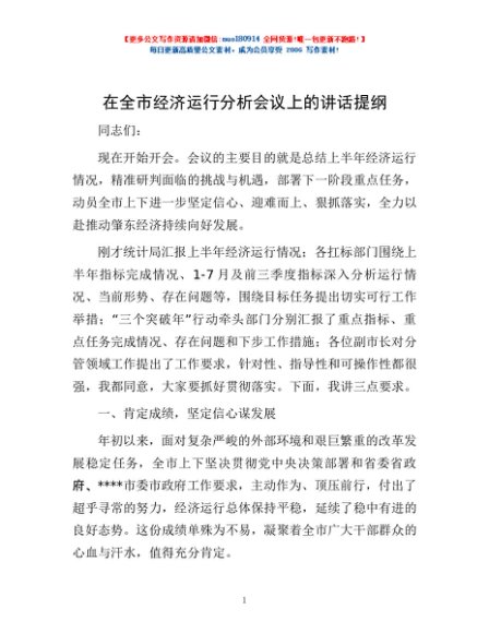 / 在全市经济运行分析会议上的讲话提纲
