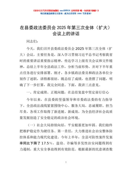 / 在县委政法委员会2025年第三次全体(扩大)会议上的讲话