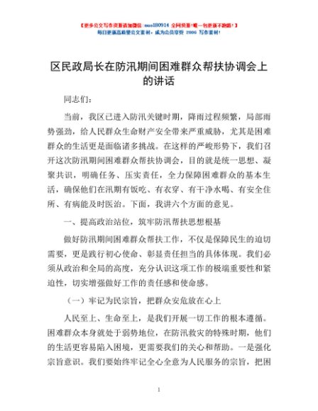 / 区民政局长在防汛期间困难群众帮扶协调会上的讲话