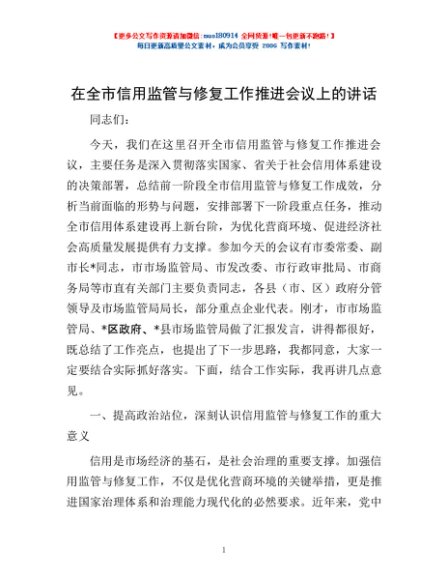 / 在全市信用监管与修复工作推进会议上的讲话
