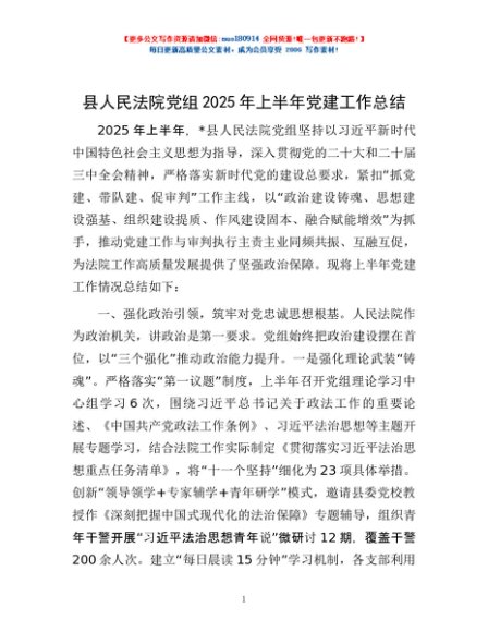 / 县人民法院党组2025年上半年党建工作总结