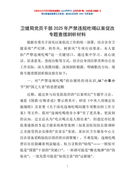 / 卫健局党员干部2025年严禁违规吃喝以案促改专题查摆剖析材料