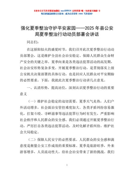 / 强化夏季整治 守护平安家园——2025年县公安局夏季整治行动动员部署会讲话