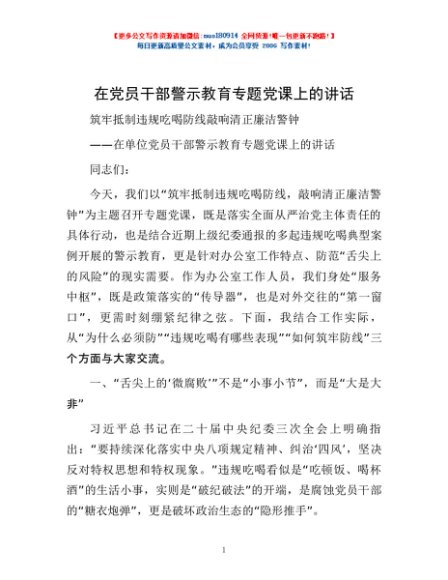 / 在党员干部警示教育专题党课上的讲话