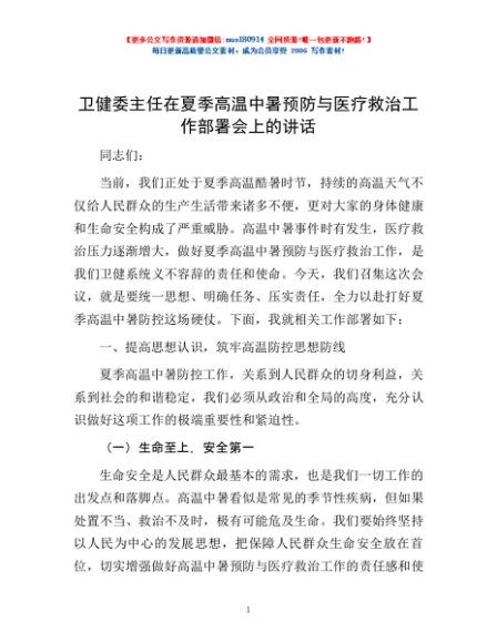 / 卫健委主任在夏季高温中暑预防与医疗救治工作部署会上的讲话