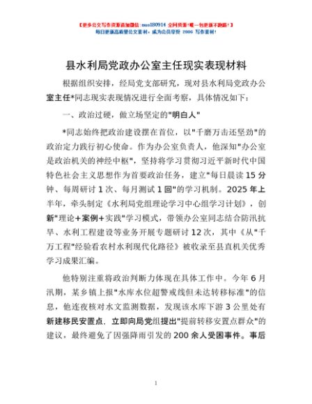 / 县水利局党政办公室主任现实表现材料