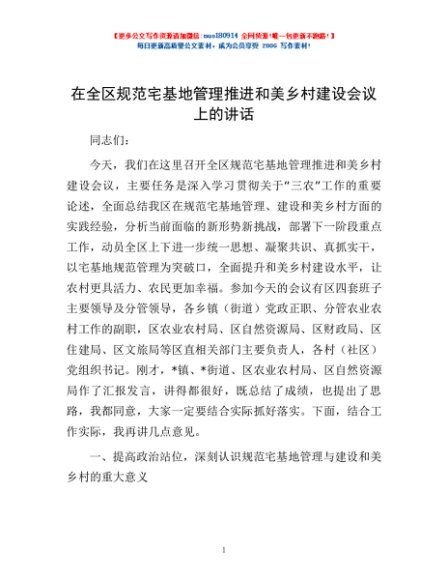 / 在全区规范宅基地管理推进和美乡村建设会议上的讲话
