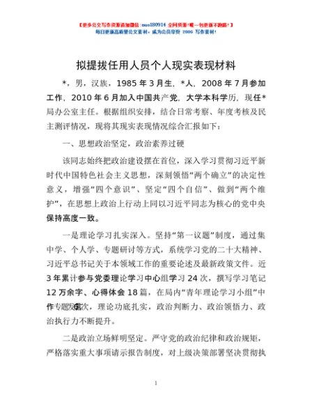 拟提拔任用人员个人现实表现材料