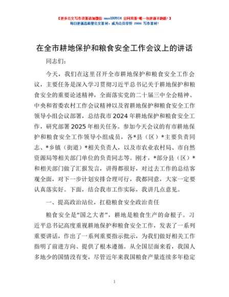 / 在全市耕地保护和粮食安全工作会议上的讲话