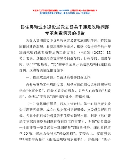 / 县住房和城乡建设局党支部关于违规吃喝问题专项自查情况的报告