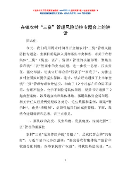 / 在镇农村“三资”管理风险防控专题会上的讲话