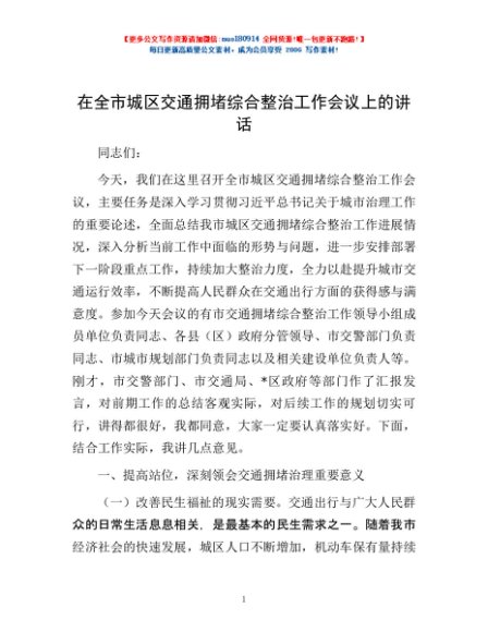 / 在全市城区交通拥堵综合整治工作会议上的讲话