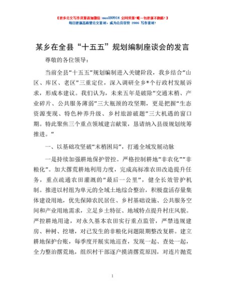 / 某乡在全县“十五五”规划编制座谈会的发言
