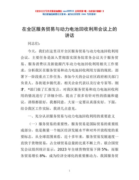 / 在全区服务贸易与动力电池回收利用会议上的讲话