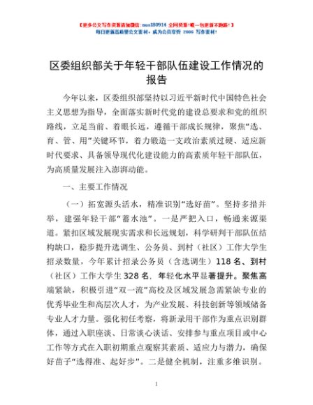 / 区委组织部关于年轻干部队伍建设工作情况的报告