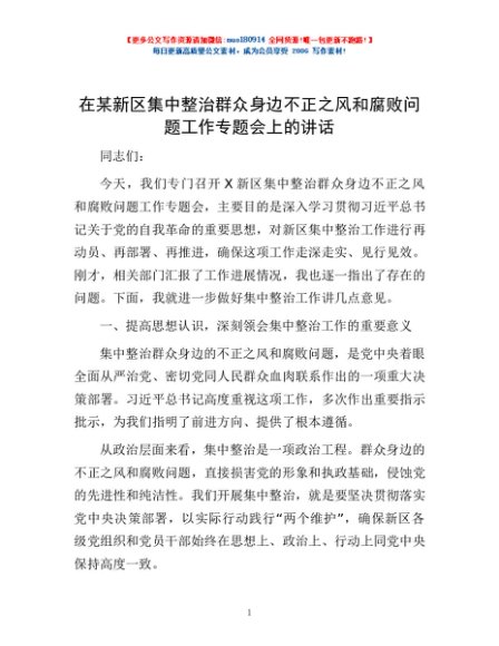 / 在某新区集中整治群众身边不正之风和腐败问题工作专题会上的讲话