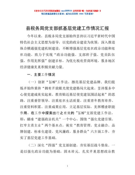 / 县税务局党支部抓基层党建工作情况汇报