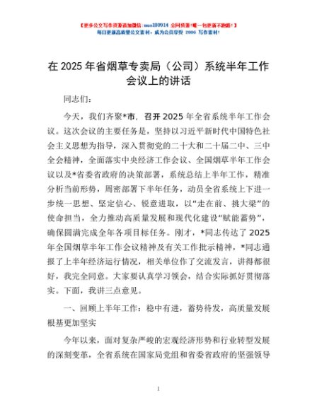 / 在2025年省烟草专卖局(公司)系统半年工作会议上的讲话