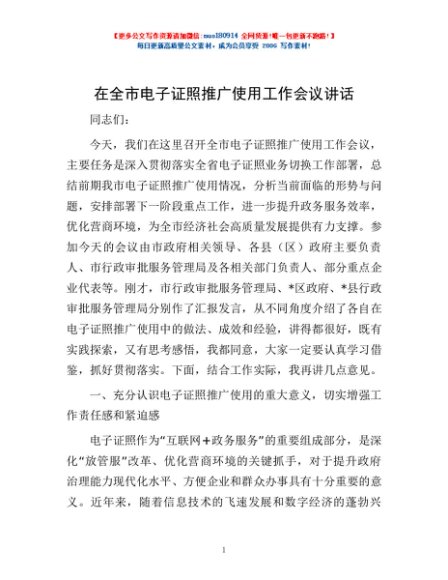 / 在全市电子证照推广使用工作会议讲话