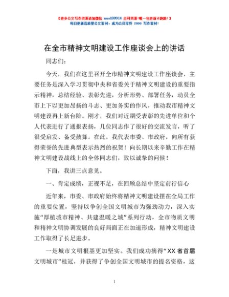 / 在全市精神文明建设工作座谈会上的讲话