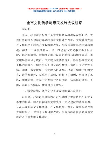 / 全市文化传承与惠民发展会议讲话