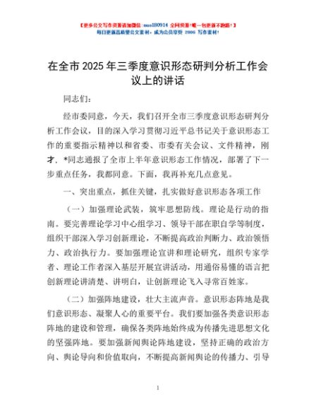 / 在全市2025年三季度意识形态研判分析工作会议上的讲话